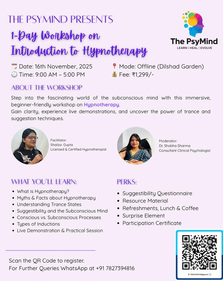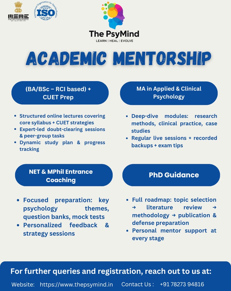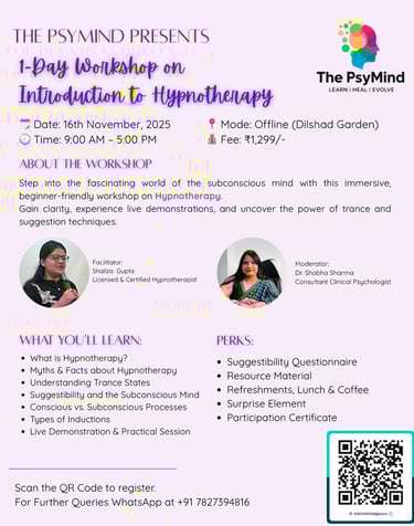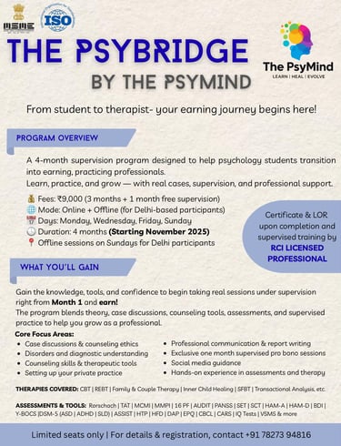 Founded by Dr.Shobha Sharma, our organization is committed to nurturing the next generation of psychology professionals. We specialize in providing hands-on internships, interactive workshops, therapy sessions by RCI-licensed psychologists, and academic guidance including lectures and dissertation support